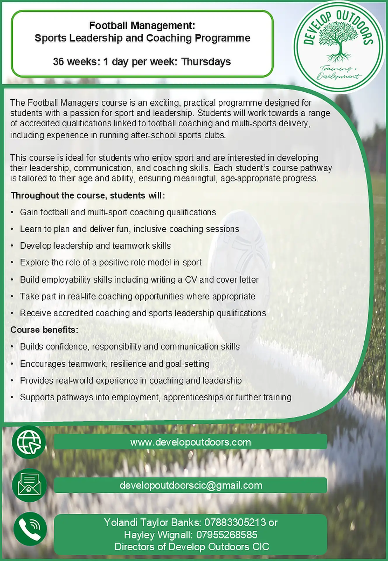 The Football Managers course is an exciting, practical programme designed for students with a passion for sport and leadership. Students will work towards a range of accredited qualifications linked to football coaching and multi-sports delivery, including experience in running after-school sports clubs.